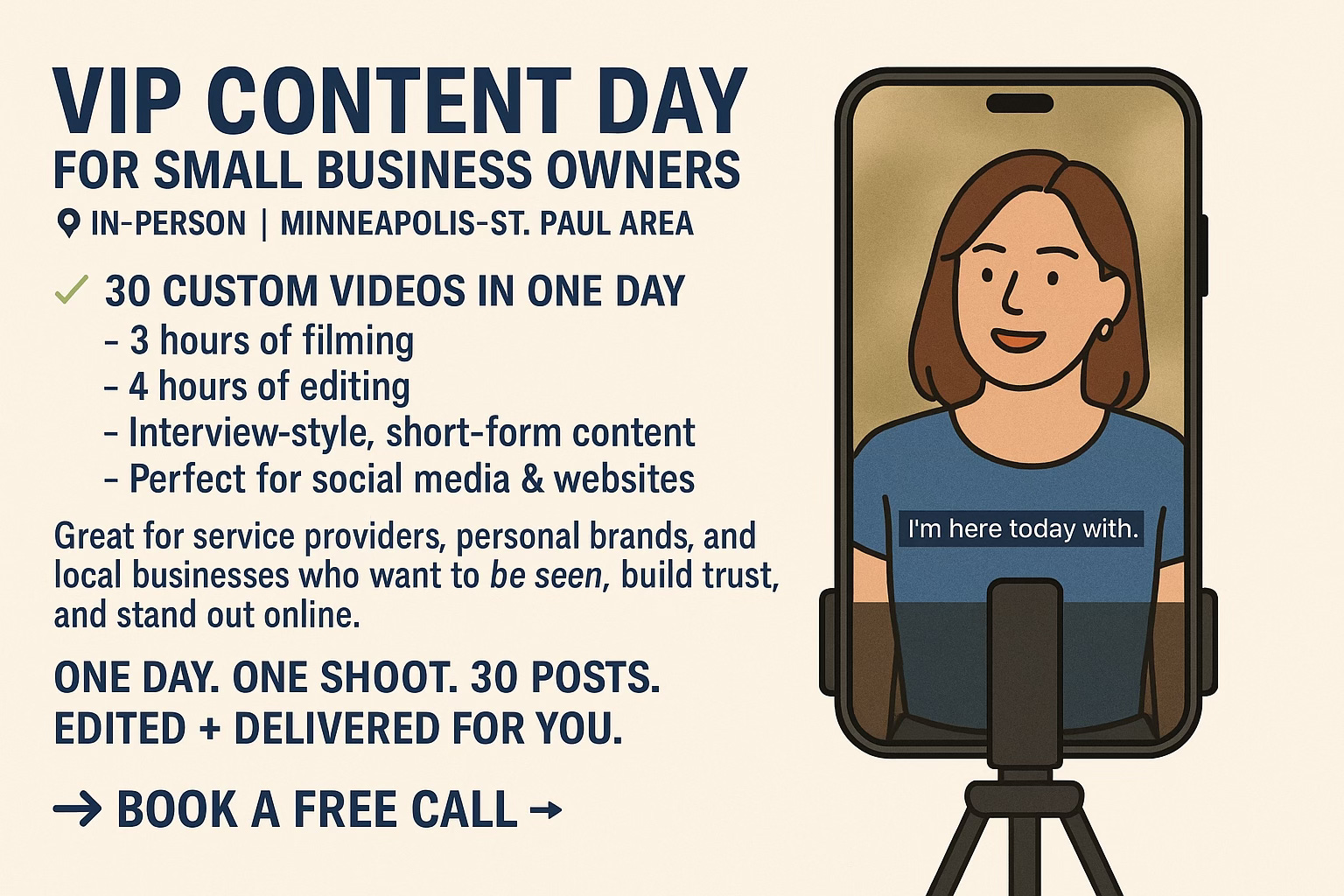 And finally, if you’re a local Twin Cities based small business owner and need help with actually creating your content, I offer VIP Social Media Video Content Days. In just one day, we film and edit 30 custom videos for your brand that you can use across all platforms. It’s honestly one of the most efficient and impactful ways to build your online presence.